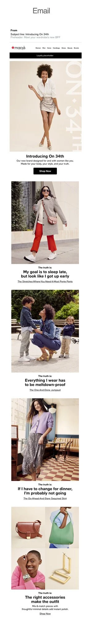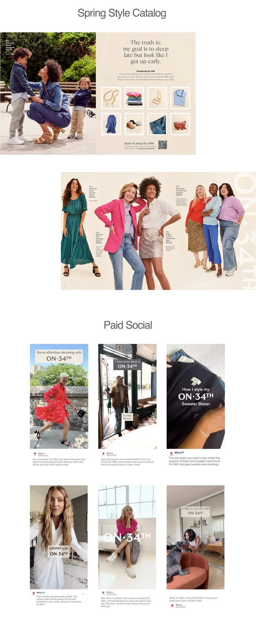 I led the creative and brand development for On 34th, Macy’s new women’s private label, overseeing brand guidelines, product naming, and the rollout across paid, owned, and earned channels. Working in partnership with our in-house team and BBDO on initial concepting, I shaped the execution and voice of the launch.